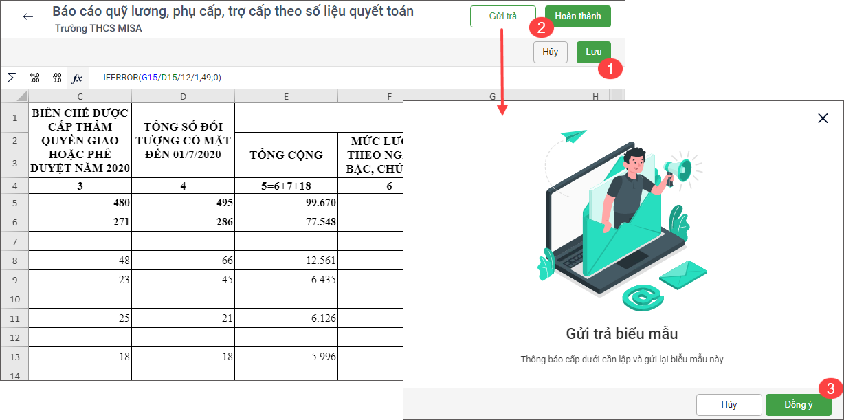 - Nhấn Đồng ý để xác nhận hoàn thành hoặc gửi trả biểu mẫu cho cấp dưới.