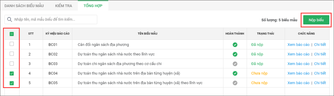 1. Chọn tab Tổng hợp để xem danh sách các mẫu biểu và trạng thái nộp: