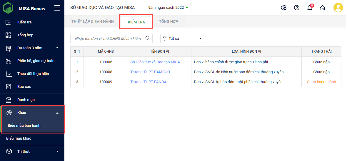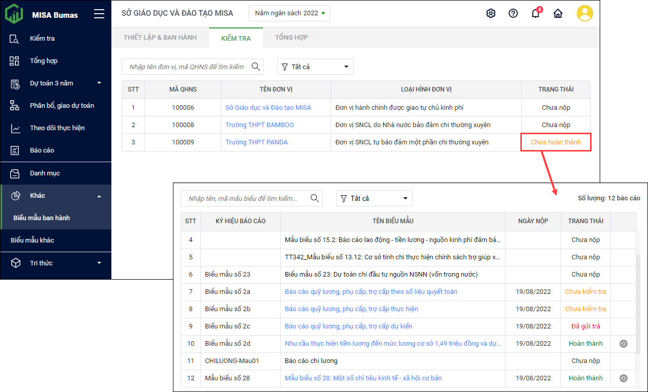 2. Chọn tab Kiểm tra để xem trạng thái nộp và trạng thái kiểm tra theo từng đơn vị cấp dưới: