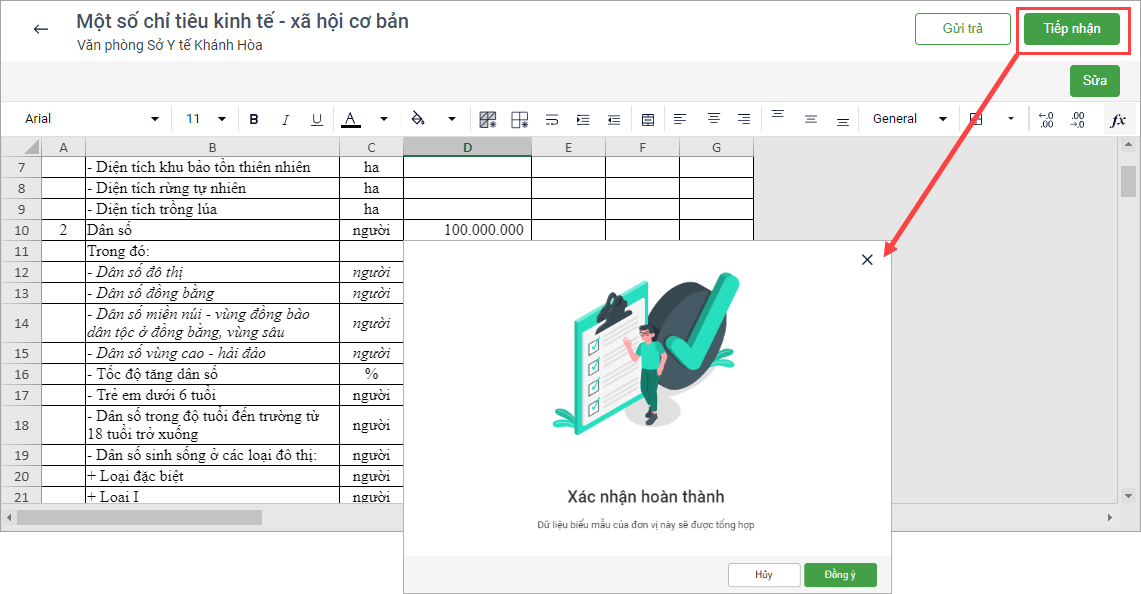 - Nhấn Tiếp nhận để hoàn thành kiểm tra báo của đơn vị cấp dưới.