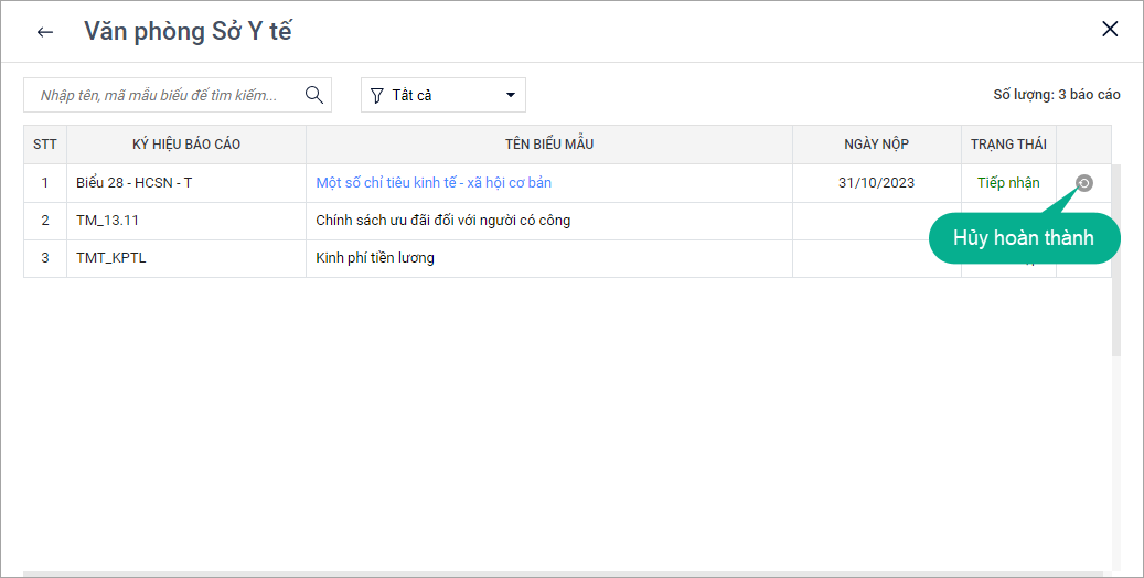 6. Nếu muốn kiểm tra lại các biểu mẫu ở trạng thái Hoàn thành/Tiếp nhận thì nhấn vào biểu tượng kiểm tra lại/hủy hoàn thành => Biểu mẫu sẽ chuyển về trạng thái Chưa kiểm tra.