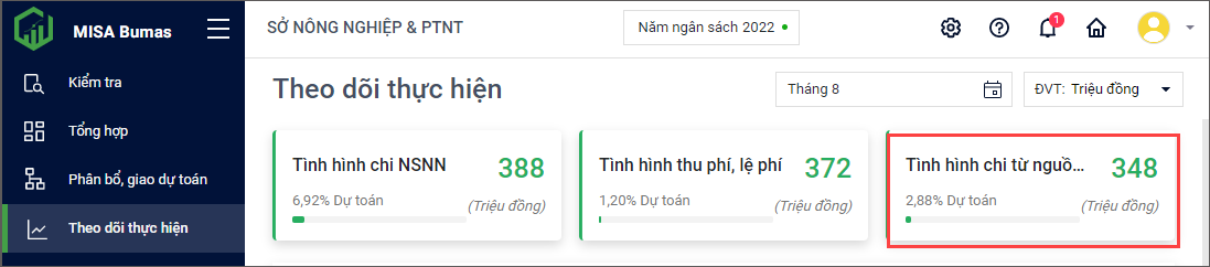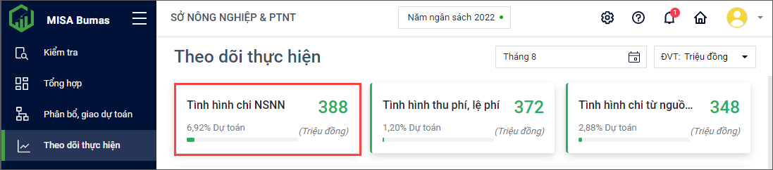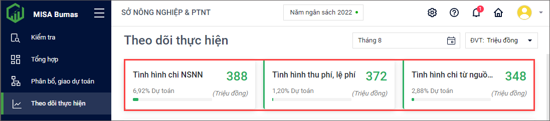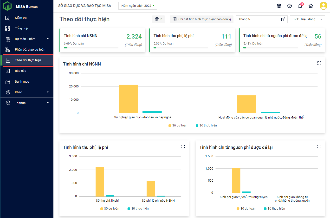 - Xem được tình hình thực hiện dự toán gồm tổng số thực hiện và tỷ lệ thực hiện của 3 nội dung: Chi ngân sách nhà nước; Thu phí, lệ phí và Chi từ nguồn phí để lại.