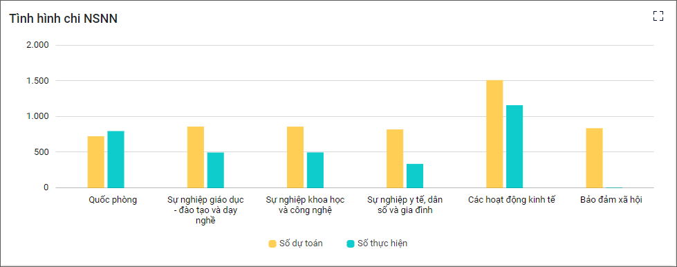 - Biểu đồ cột Tình hình chi NSNN: Xem Số dự toán và Số thực hiện của các lĩnh vực thuộc Chi NSNN.
