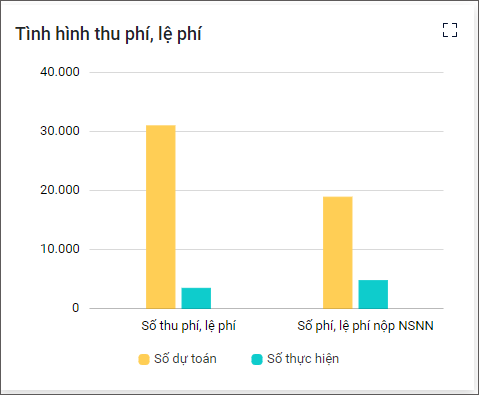 - Biểu đồ cột Tình hình thu phí, lệ phí: Xem Số dự toán và Số thực hiện của Số thu phí, lệ phí và Số phí, lệ phí nộp NSNN.