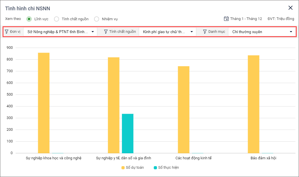 - Anh/chị có thể theo dõi tình hình thực hiện chi NSNN theo nhiều chiều. Chế độ mặc định là theo dõi theo Lĩnh vực. Tại chế độ này, anh/chị có thể tùy chọn Đơn vị, Tính chất nguồn và Danh mục cần xem.