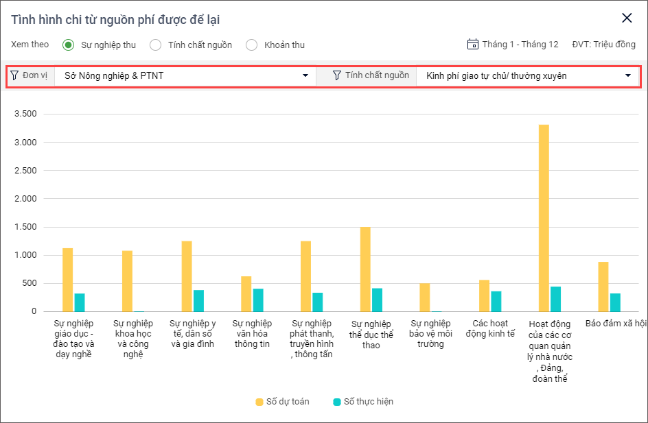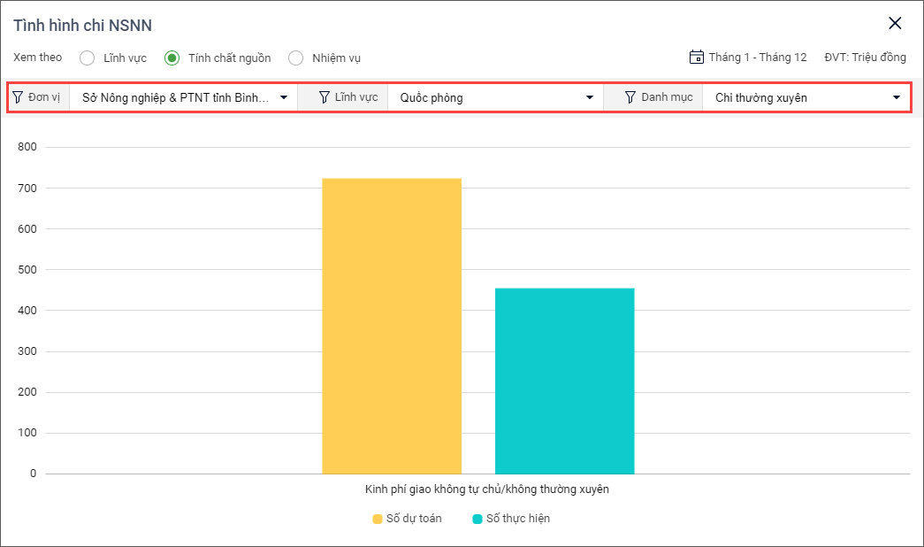 Ví dụ: Theo dõi tình hình chi NSNN theo Lĩnh vực, tại đơn vị Sở Nông nghiệp & PTNT, tính chất nguồn Kinh phí giao tự chủ/thường xuyên và danh mục Chi thường xuyên.