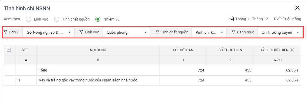 - Anh/chị cũng có thể theo dõi tình hình thực hiện chi NSNN chi tiết đến Nhiệm vụ. Tại chế độ này, anh/chị có thể tùy chọn Đơn vị, Lĩnh vực, Tính chất nguồn và Danh mục cần xem.