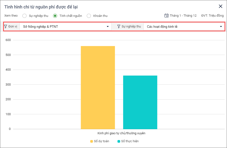 - Nếu xem theo Tính chất nguồn, anh/chị có thể tùy chọn Đơn vị và Sự nghiệp thu cần xem.