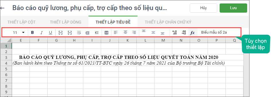 – Thiết lập dòng cột: Chọn từng tab Thiết lập cột, Thiết lập dòng, Thiết lập tiêu đề, Thiết lập chân chữ ký và nhập lần lượt các nội dung cụ thể.