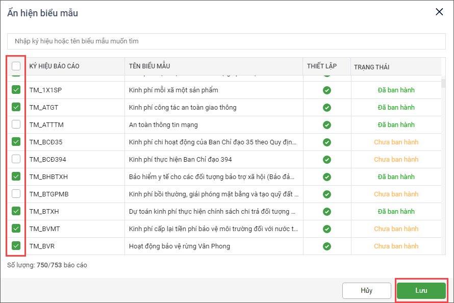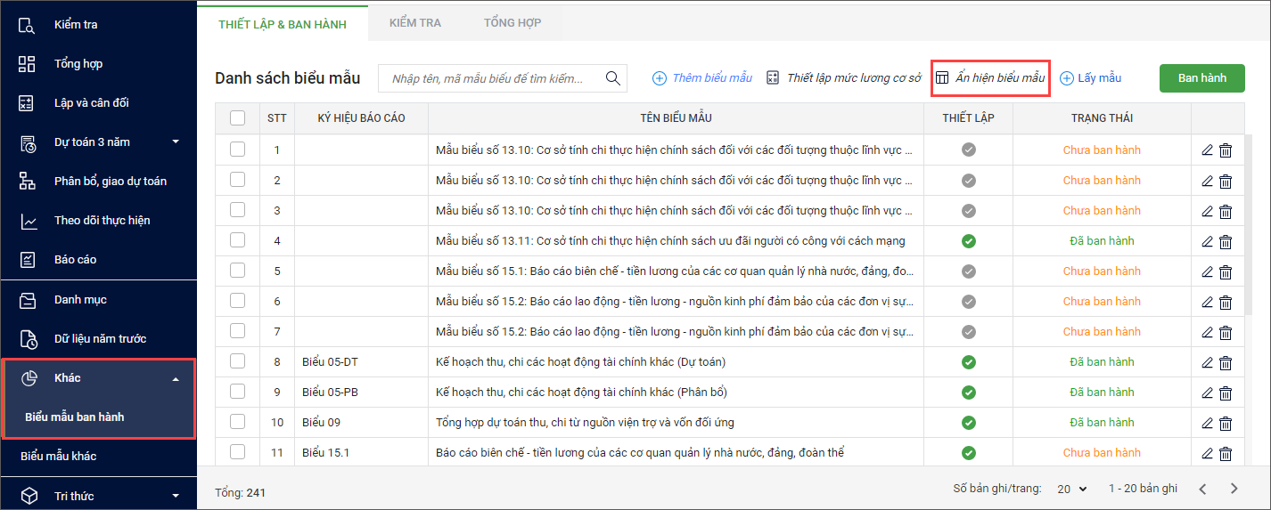 2. Chọn Ẩn/hiện biểu mẫu để hiển thị các báo cáo muốn hiện phục vụ cho việc ban hành báo cáo xuống cho đơn vị cấp dưới.