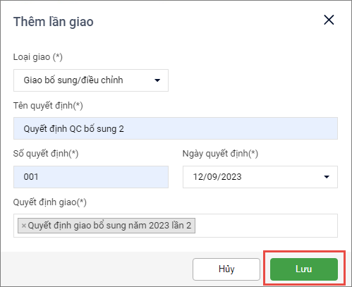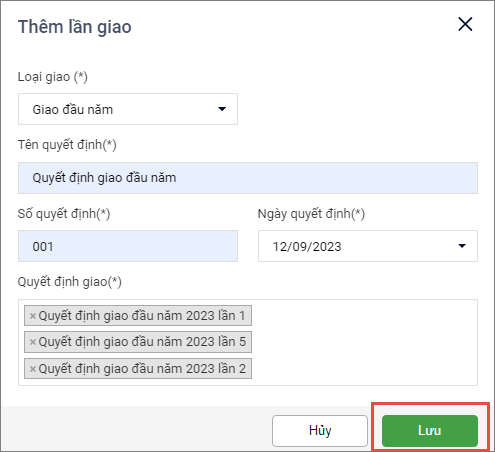 • Nhập Tên quyết định, Số quyết định, chọn Ngày quyết định, Quyết định giao (anh/chị có thể chọn nhiều quyết định giao).