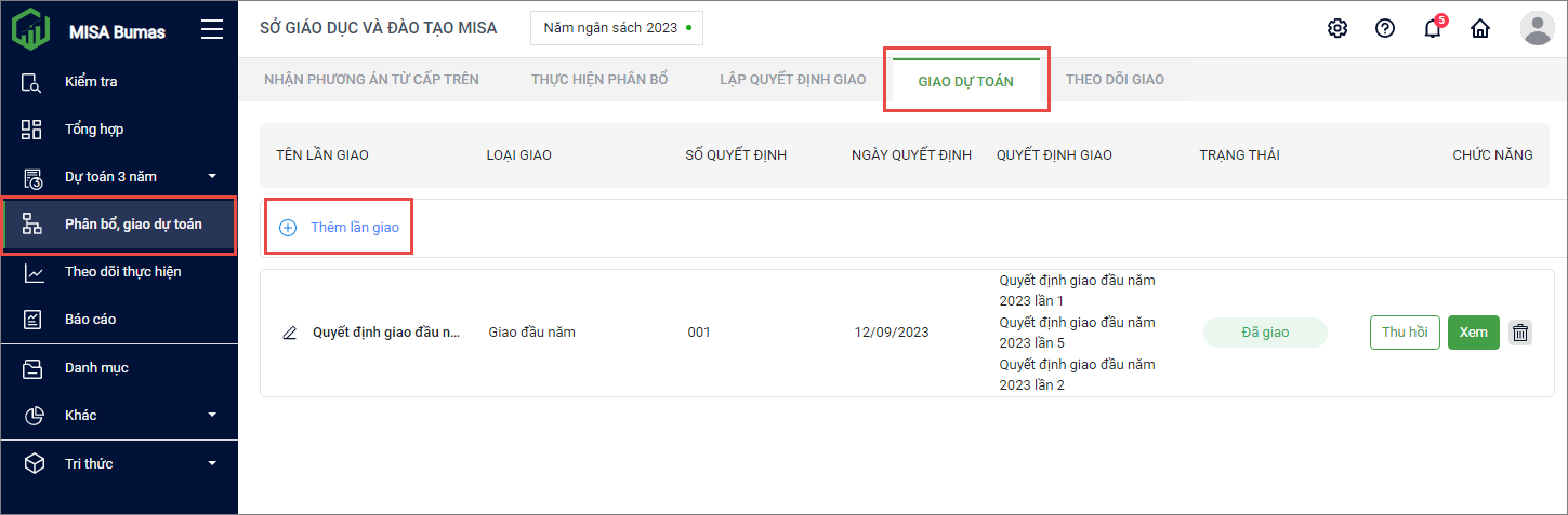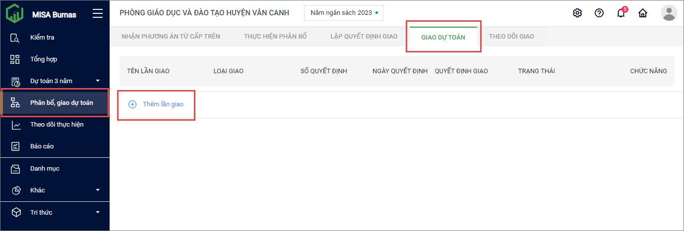 1. Chọn menu Phân bổ, giao dự toán. Chọn tab Giao dự toán. Nhấn Thêm lần giao.
