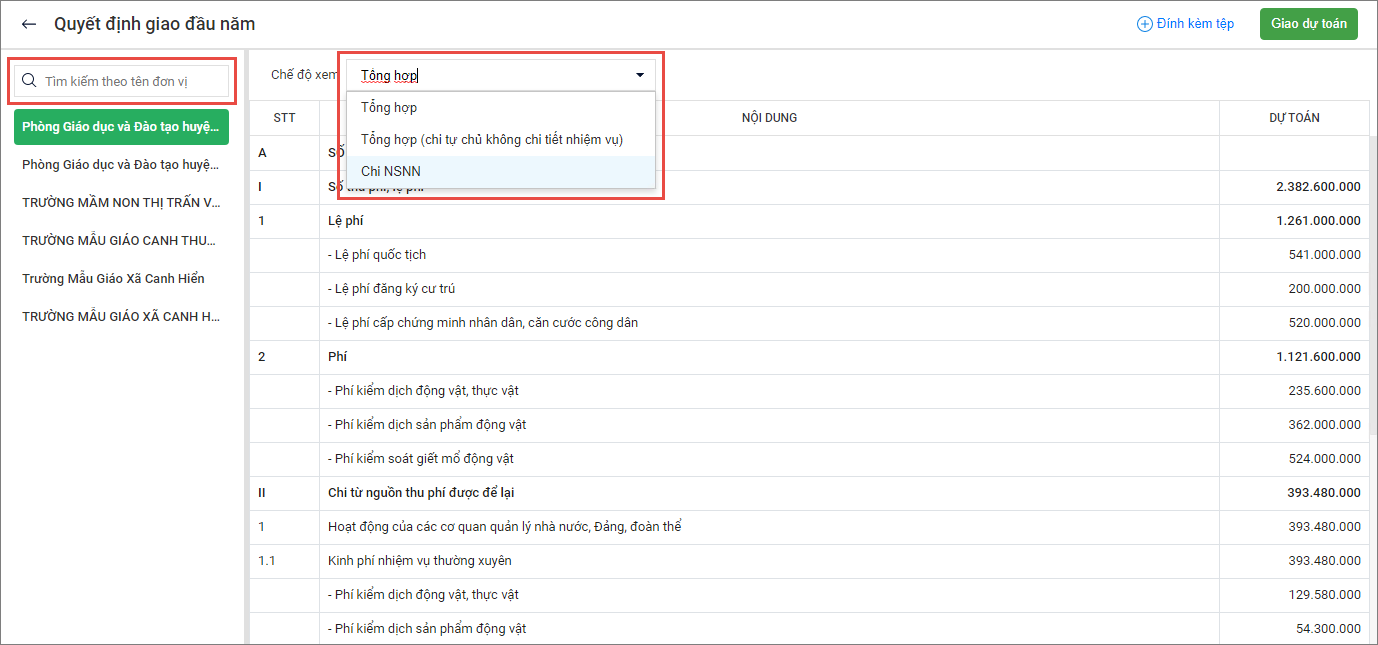 • Chọn đơn vị để xem dự toán, chọn chế độ xem theo Tổng hợp, Tổng hợp (chi tự chủ không chi tiết nhiệm vụ), Chi NSNN.