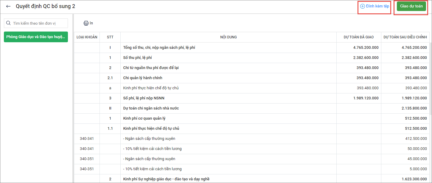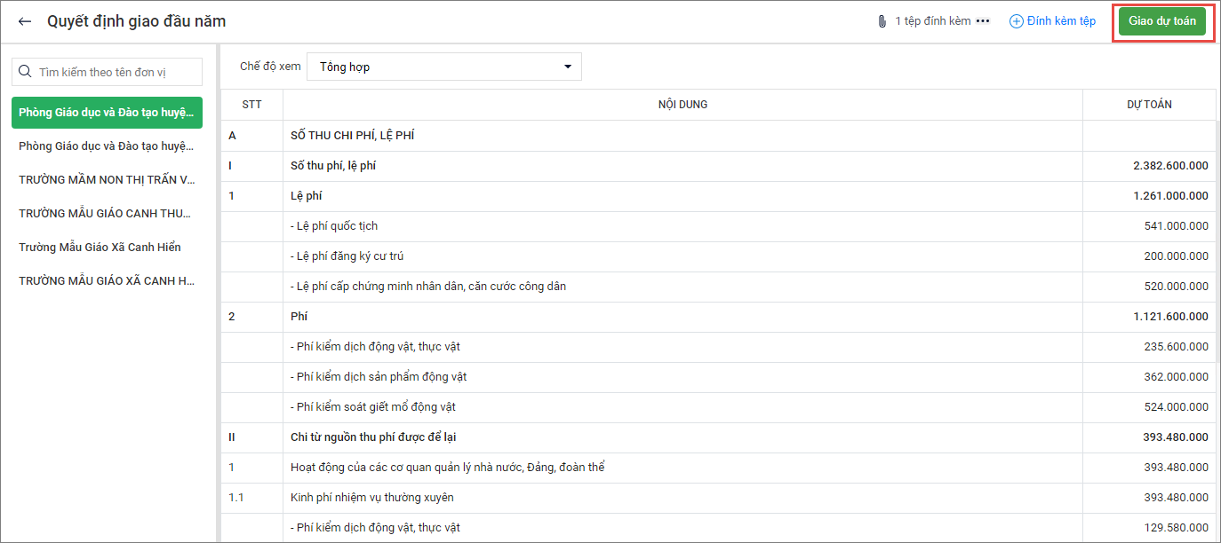 3. Nhấn vào Giao dự toán để giao dự toán xuống cho đơn vị cấp dưới.