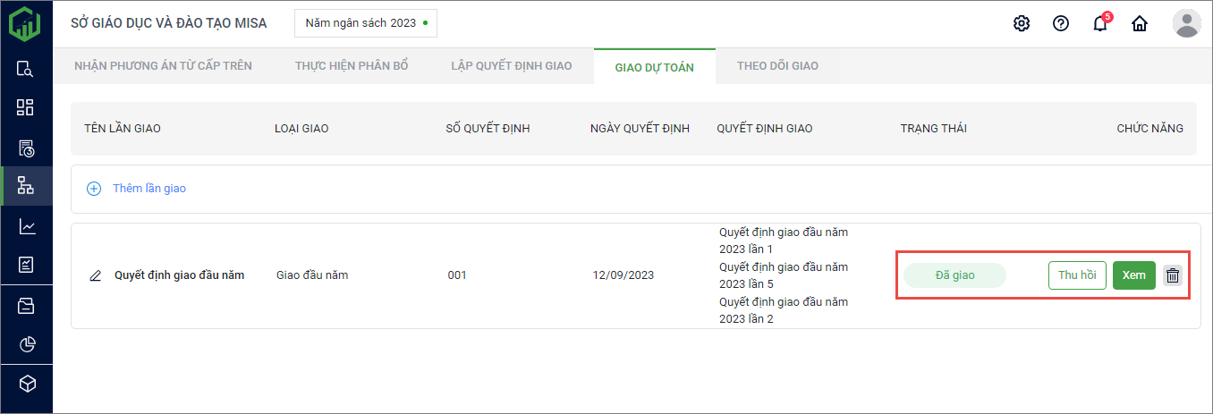 • Dự toán đã giao sẽ chuyển trạng thái là Đã giao.