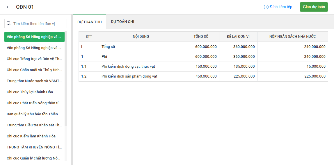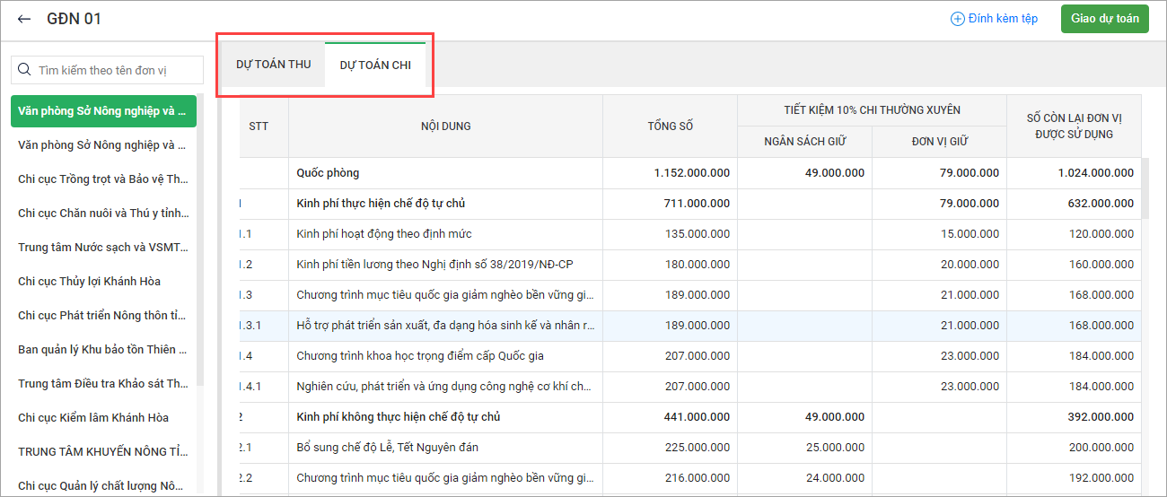 *Lưu ý: Với các đơn vị cấp dưới trực thuộc Sở tài chính tỉnh Khánh Hòa màn hình giao dự toán cho đơn vị cấp dưới sẽ hiển thị như sau: