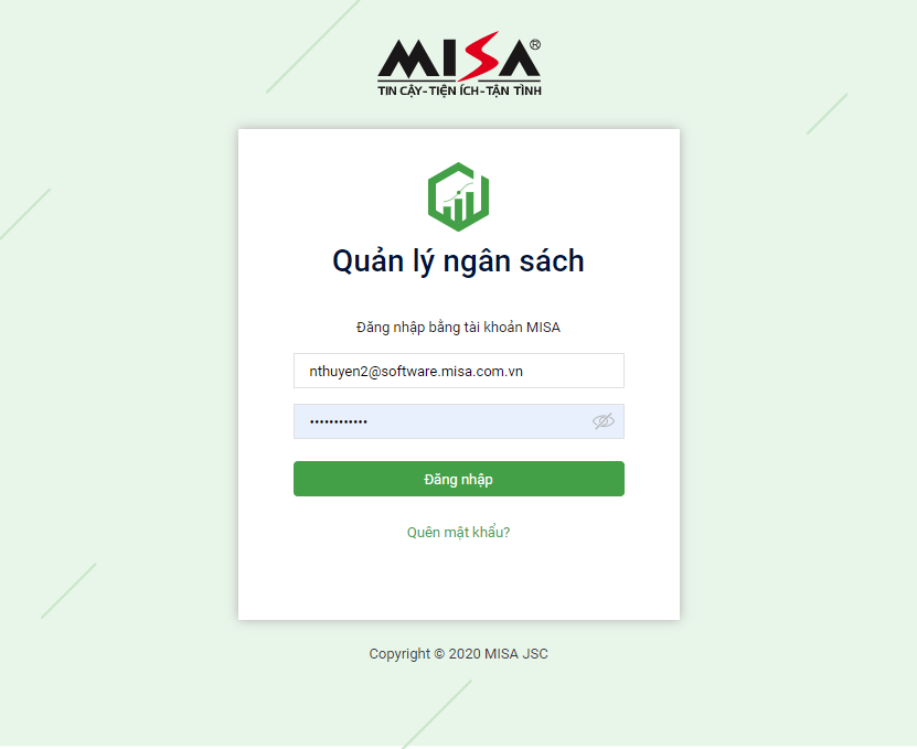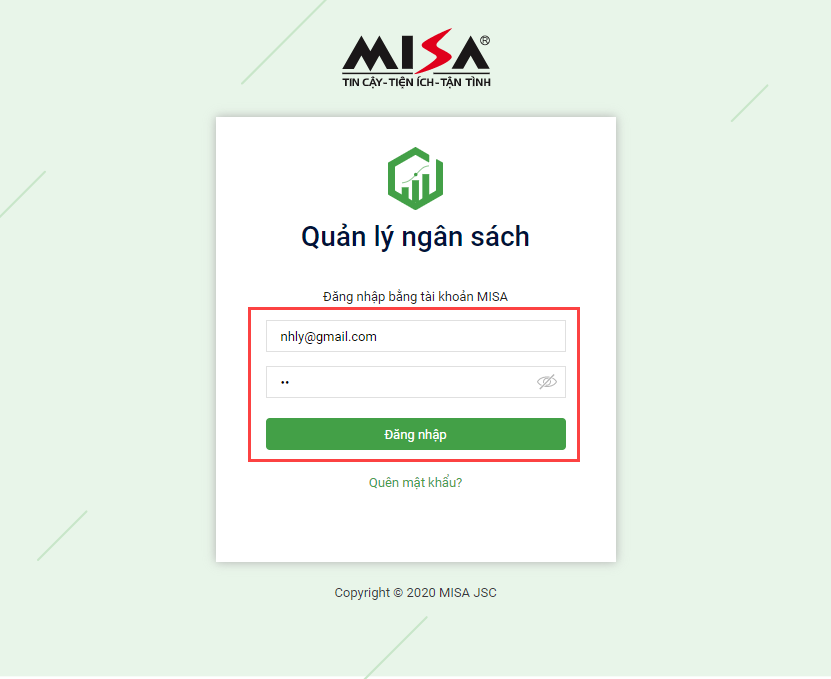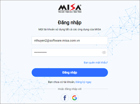 1. Đơn vị đăng nhập vào phần mềm, nhập Tên đăng nhập là Email đã dùng để đăng ký tài khoản MISA ID.