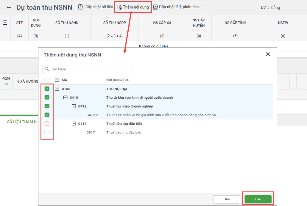 - Anh/chị tích chọn nội dung thu cần lập dự toán, sau đó nhấn Lưu. Trong trường hợp bảng Thêm nội dung Thu NSNN không hiển thị nội dung thu anh/chị muốn chọn để lập dự toán, do đơn vị ngưng sử dụng/chưa có nội dung thu đó trong danh mục Thu NSNN, để tích chọn sử dụng/thêm nội dung thu đó anh/chị xem hướng dẫn Thiết lập danh mục Thu NSNN tại đây.