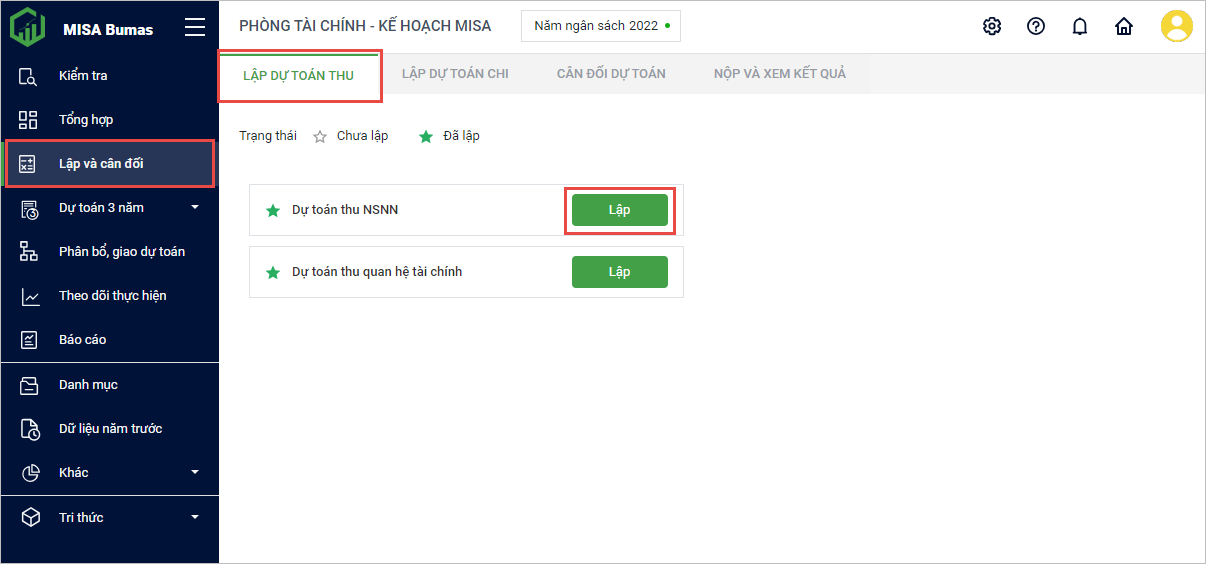 1. Chọn menu Lập và cân đối\tại tab Lập dự toán thu\Nhấn Lập tại phần Dự toán thu NSNN.