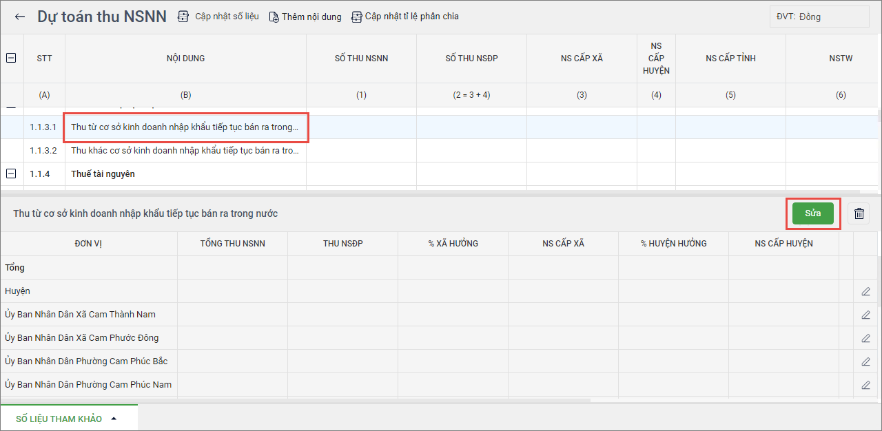 - Chọn nội dung thu cần lập dự toán, nhấn Sửa.