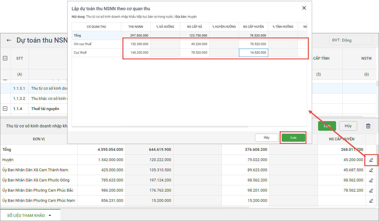 - Nếu đơn vị muốn lập dự toán thu NSNN theo cơ quan thu. Anh/chị chọn biểu tượng cây bút bên cạnh đơn vị cấp dưới cần lập dự toán, Sau đó nhập thông tin cho bảng Lập dự toán thu NSNN theo cơ quan thu, Sau đó nhấn Lưu.