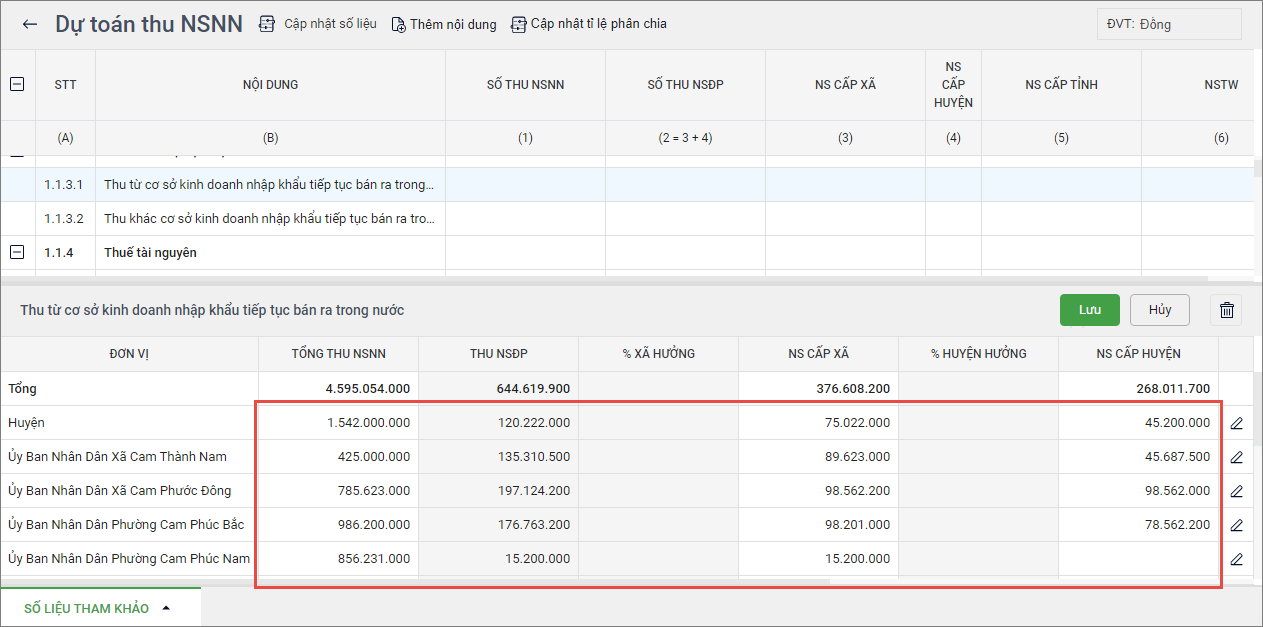 Phần này chỉ áp dụng cho các đơn vị Phòng tài chính lập dự toán thu NSNN theo tỷ lệ phân chia đã được đơn vị cấp trên thiết lập trước đó. Phòng tài chính tiến hành lập dự toán thu NSNN và không thể sửa được tỷ lệ phân chia mà đơn vị cấp trên đã thiết lập trước đó.