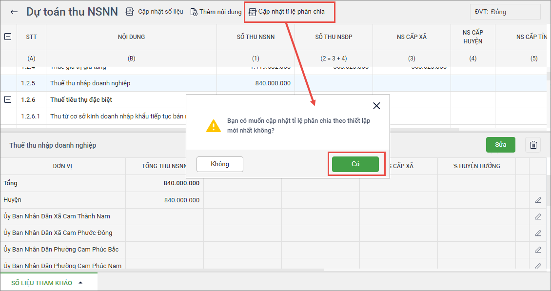 - Tích chọn Cập nhật tỷ lệ phân chia, Nhấn Có để cập nhật tỷ lệ phân chia.