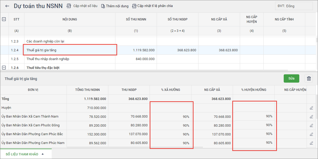 Sở tài chính đã thiết lập tỷ lệ phân chia cho Phòng tài chính và các đơn vị cấp dưới trực thuộc Phòng tài chính. Để cập nhật tỷ lệ phân chia vào bảng lập dự toán anh/chị thực hiện như sau: