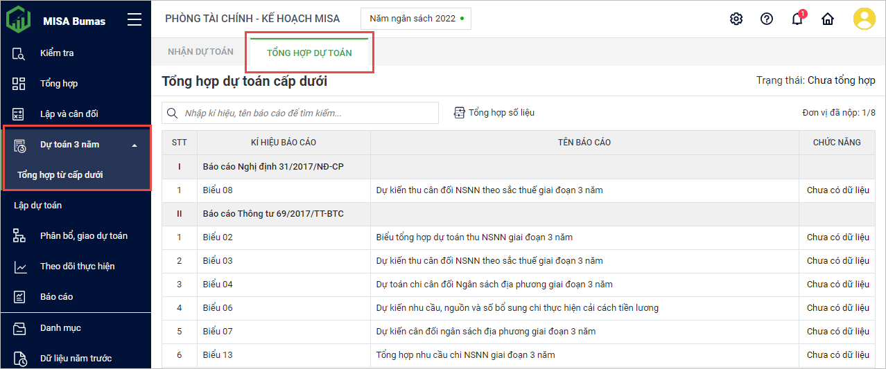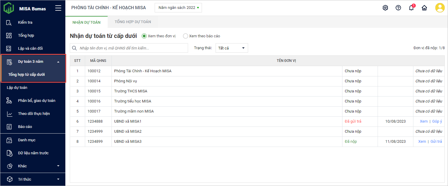 - Trạng thái Chưa nộp: Đơn vị cấp dưới chưa nộp dự toán ba năm.