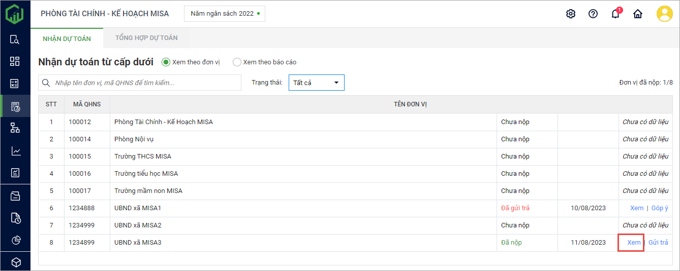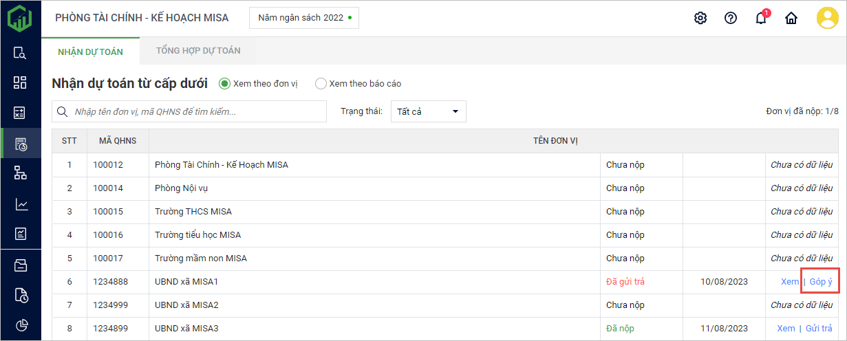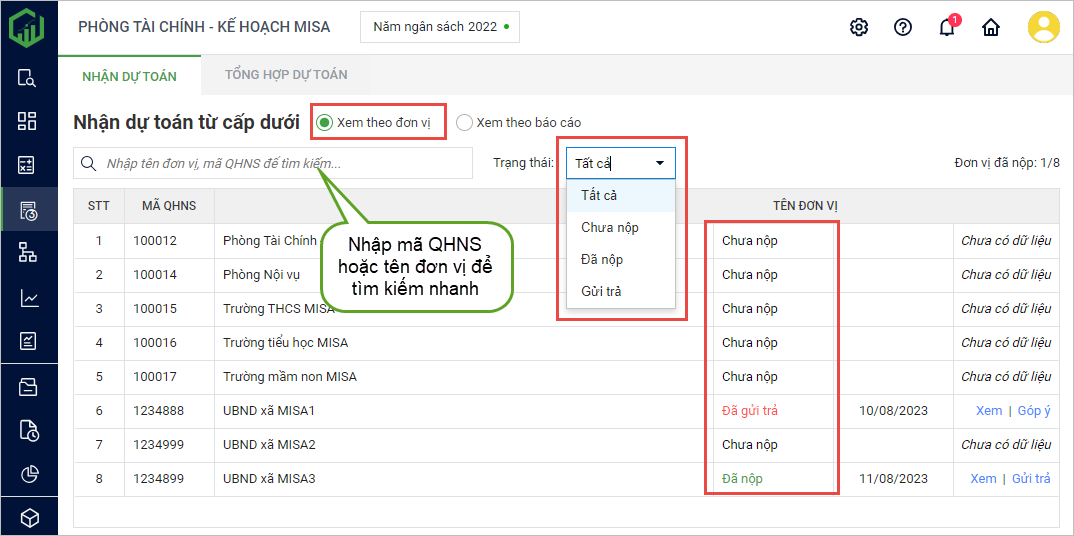 - Lọc nhanh trạng thái nộp dự toán của đơn vị cấp dưới bằng cách nhấn vào bộ lọc.