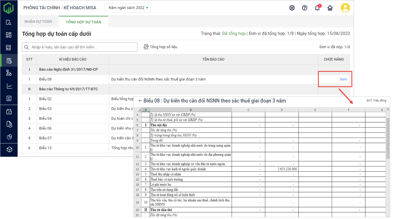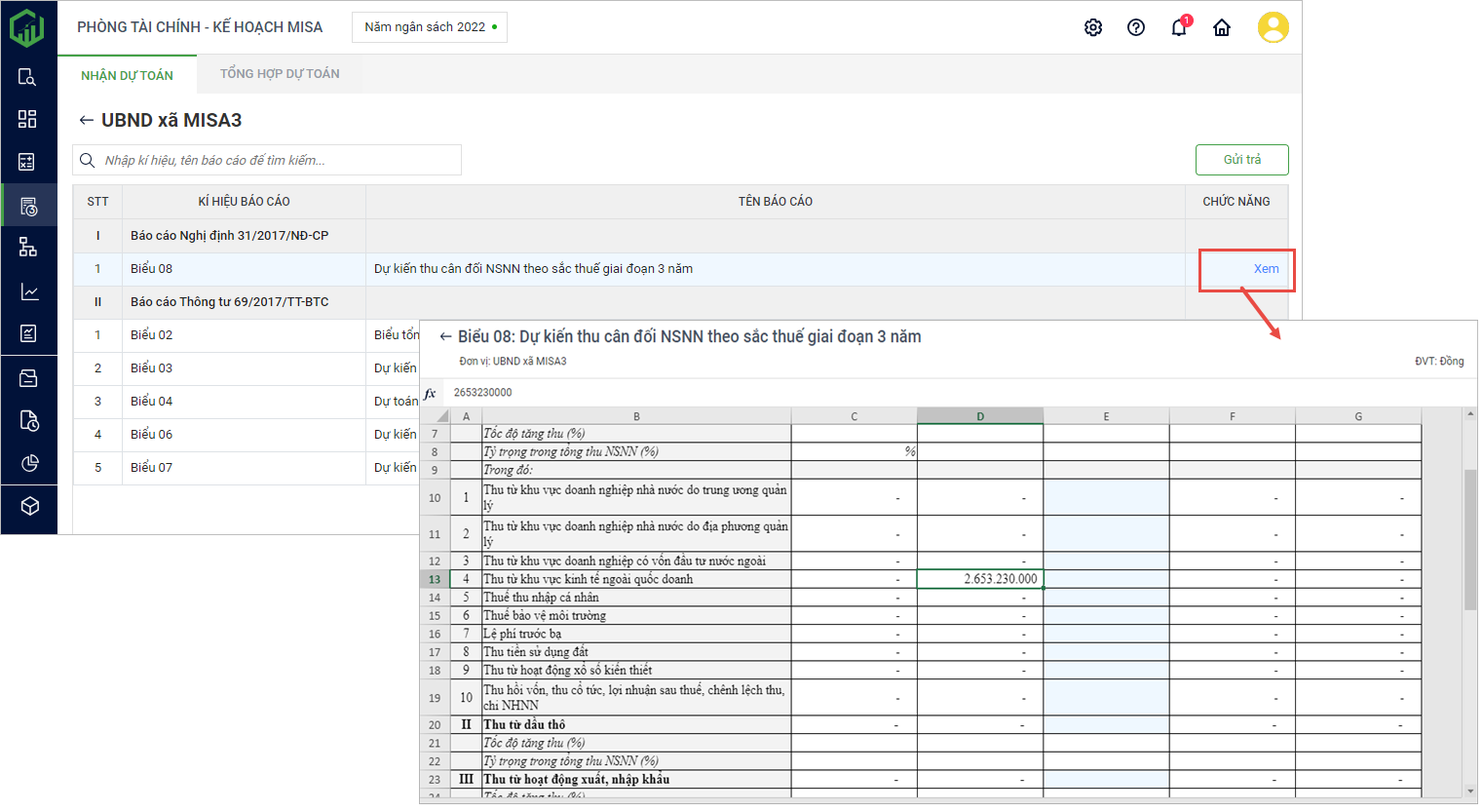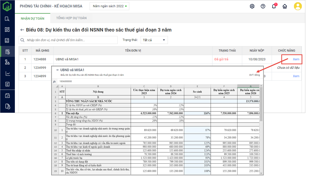 3. Lúc này màn hình hiển thị danh sách báo cáo dự toán ba năm của đơn vị. Nhấn Xem để xem chi tiết báo cáo.