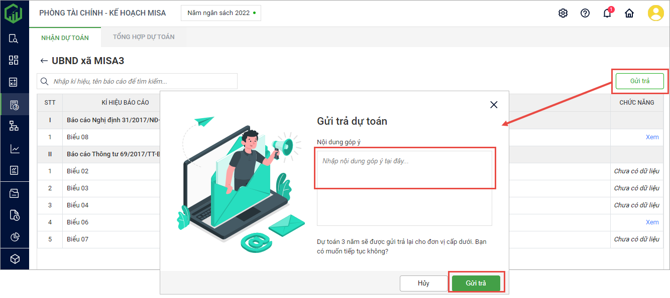 - Trạng thái Đã gửi trả: Đơn vị cấp trên đã kiểm tra dự toán của đơn vị cấp dưới và gửi phản hồi dự toán.