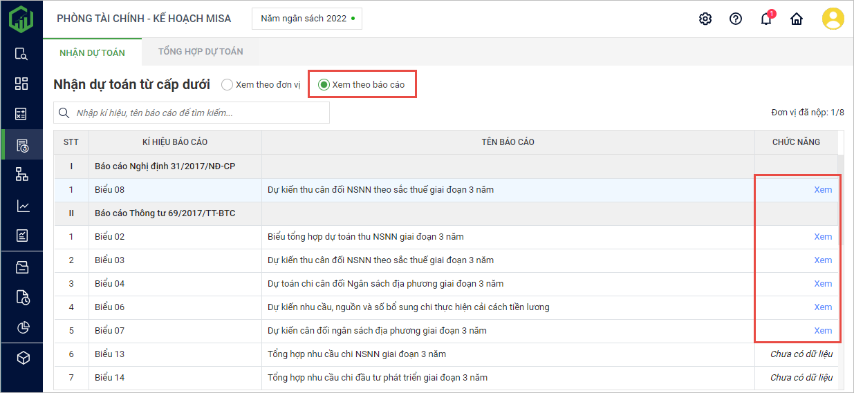 1. Tại tab Nhận dự toán, chọn Xem theo báo cáo.