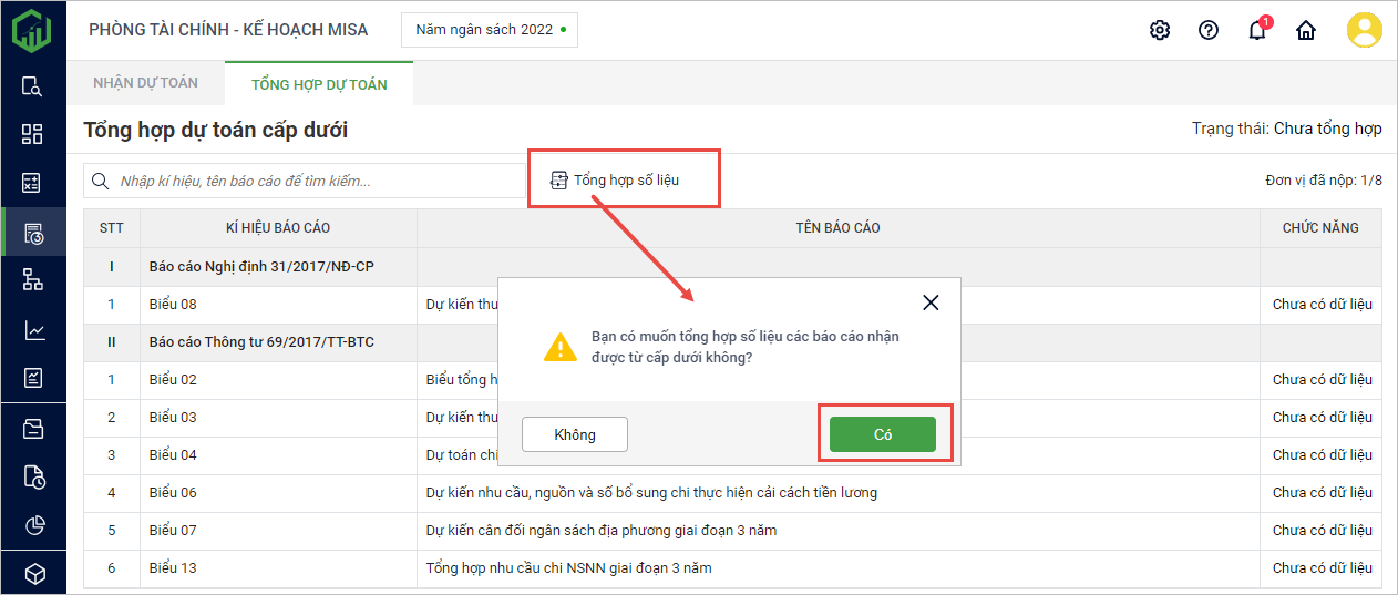 4. Trường hợp anh/chị đã tổng hợp số liệu trước đó rồi, phần mềm sẽ hiển thị thông báo. Nhấn Có nếu chắc chắn muốn cập nhật số liệu mới nhất từ các đơn vị đã nộp báo cáo.