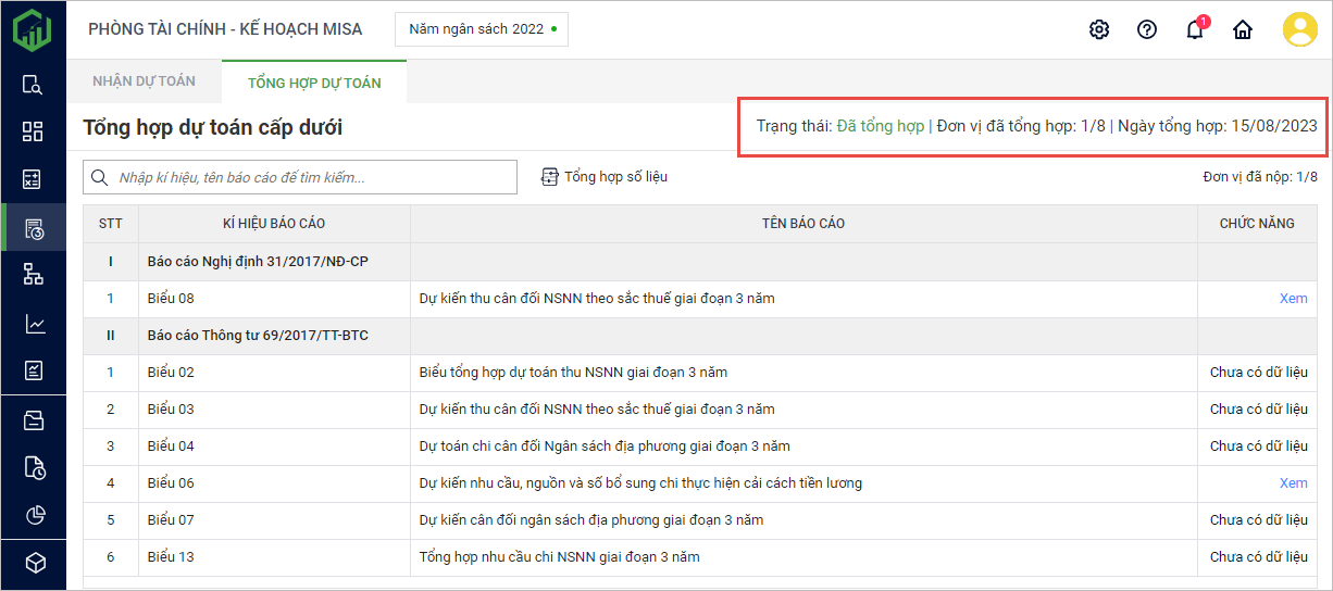 2. Chọn tab Tổng hợp dự toán. Lúc này màn hình hiển thị danh sách tất cả các báo cáo của đơn vị cấp dưới.