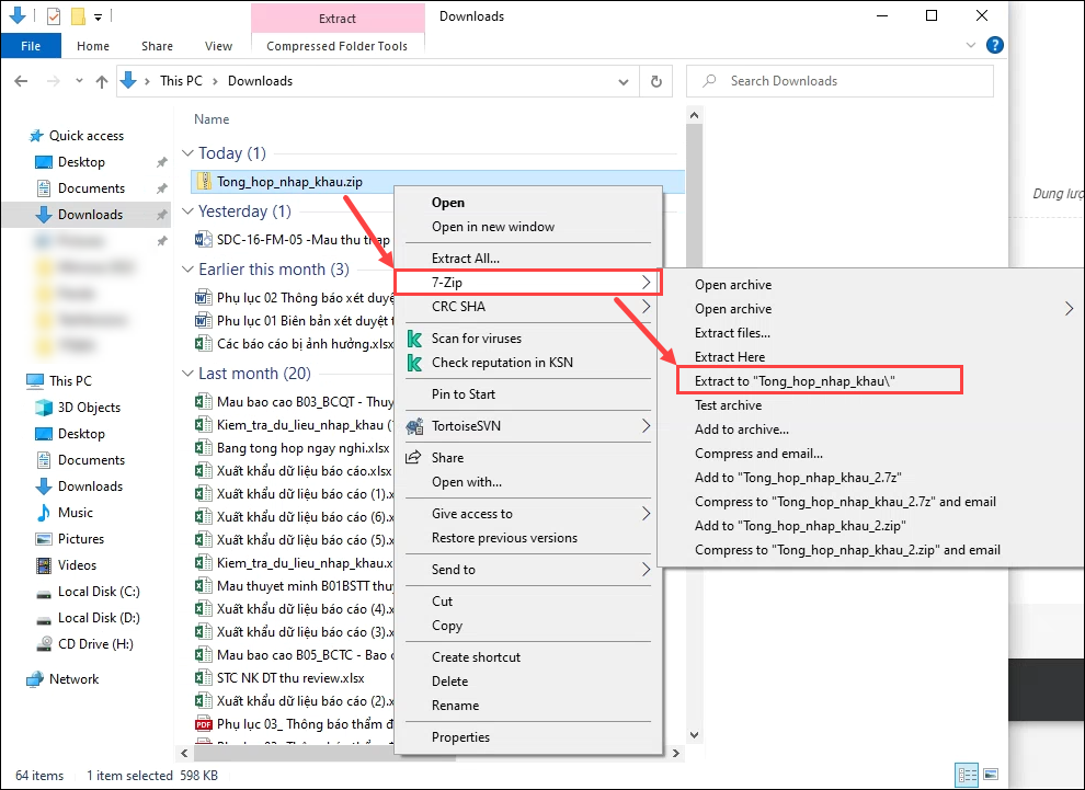 - Thực hiện giải nén bằng cách nhấn chuột phải vào tập tin, chọn 7-Zip, chọn Extract files…/Extract Here/Extract to…