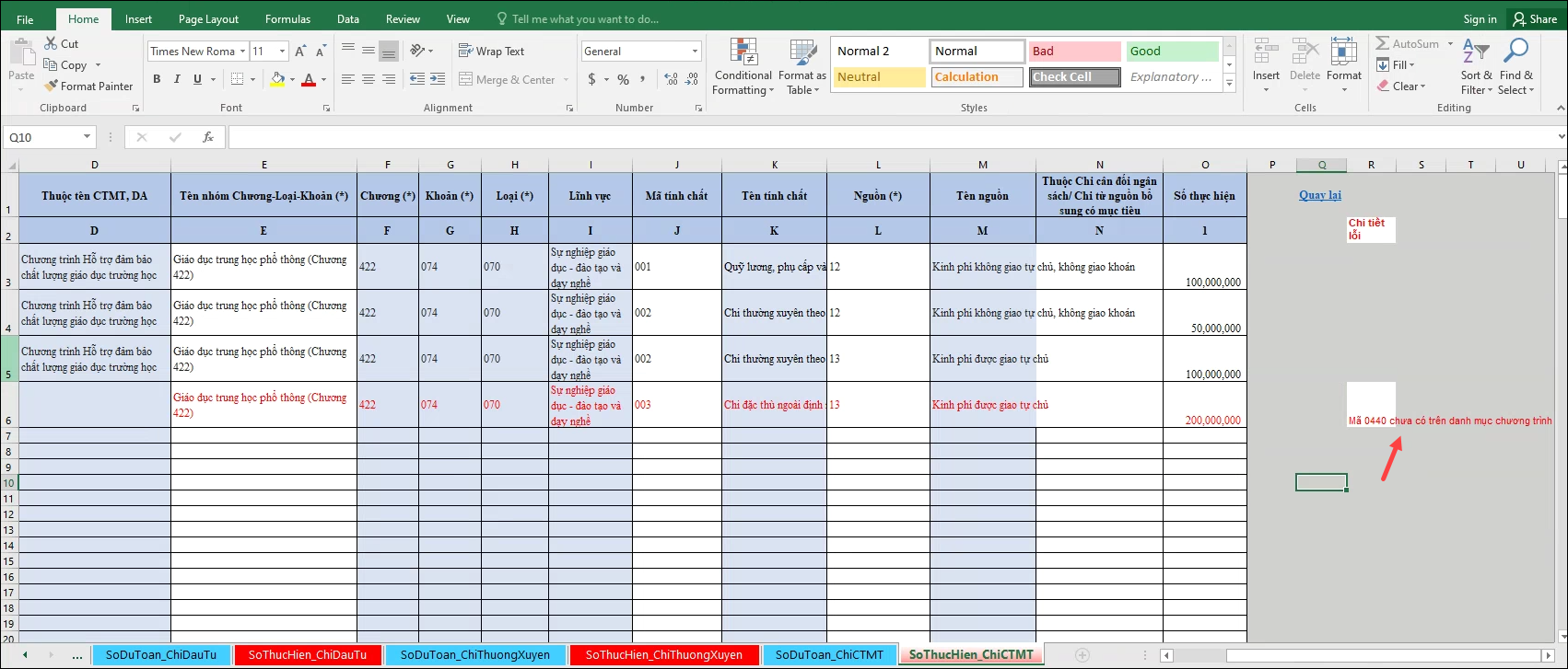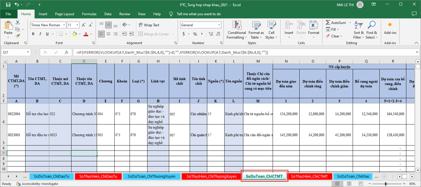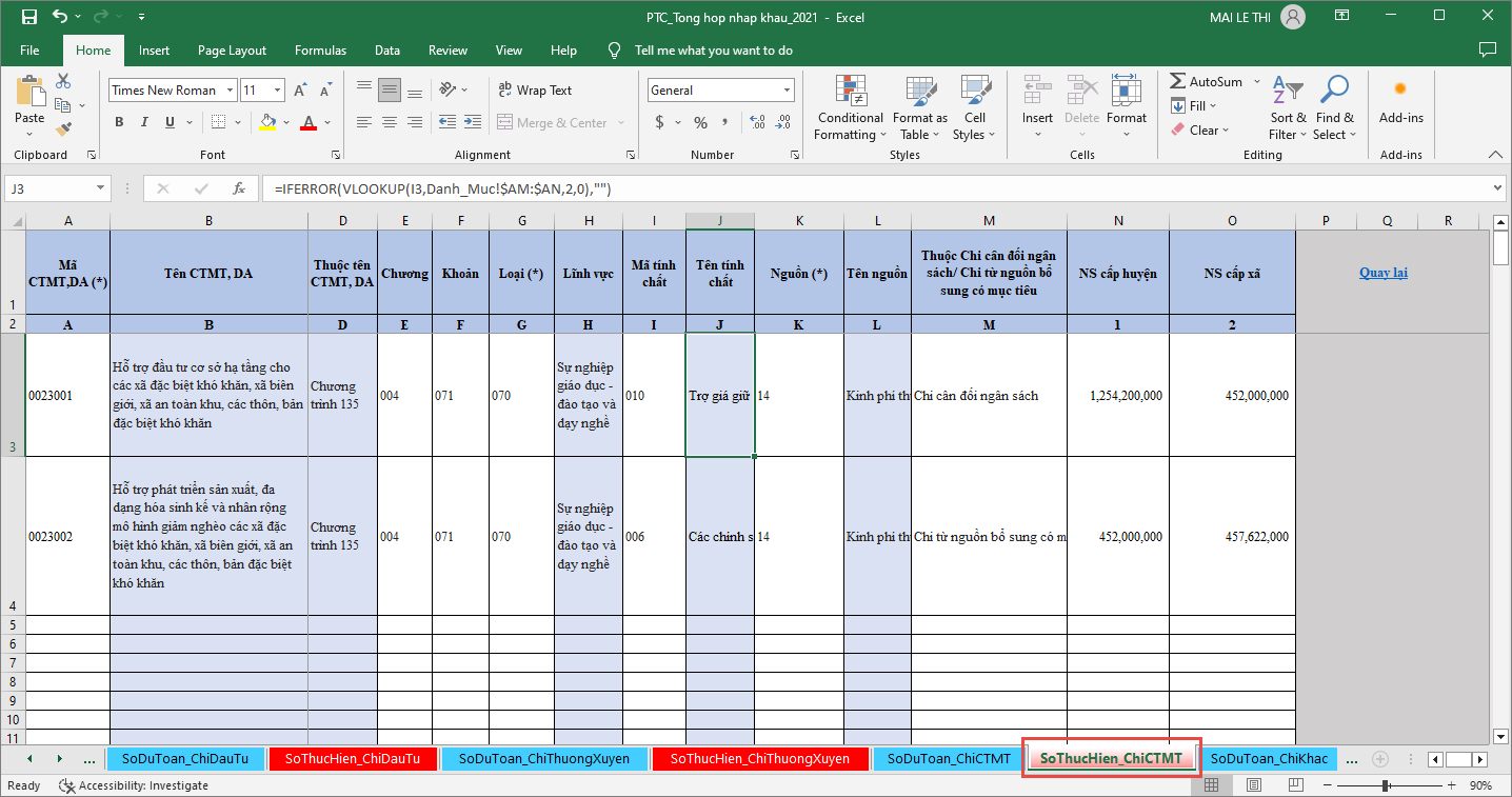 - Chọn sheet SoThucHien_ChiCTMT để nhập Số thực hiện Chi CTMT, DA.