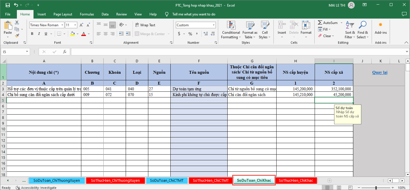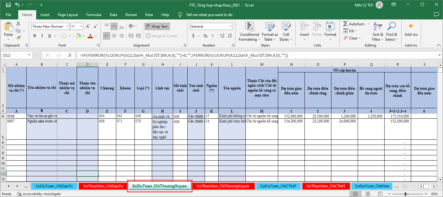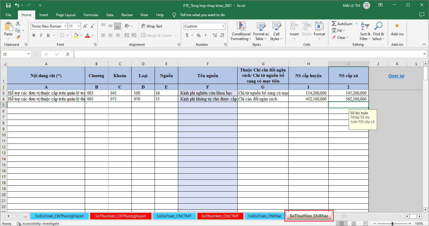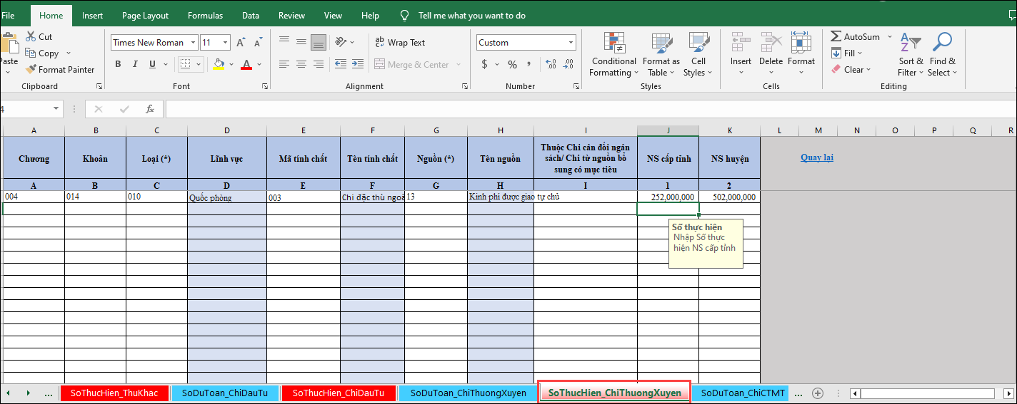 - Chọn sheet SoThucHien_ChiThuongXuyen để nhập Số thực hiện Chi thường xuyên.