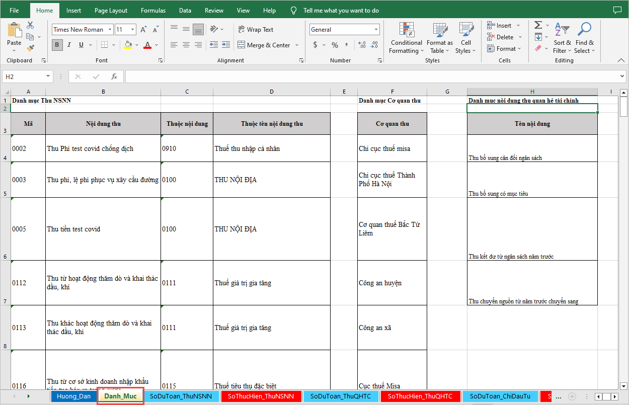 - Chọn sheet Danh_Muc để xem các danh mục Mục lục ngân sách; Nhóm Chương – Loại – Khoản; Thu phí, lệ phí; Thu HĐSN dịch vụ; Chi đầu tư phát triển; Chi thường xuyên; Chi CTMT, mục tiêu khác.