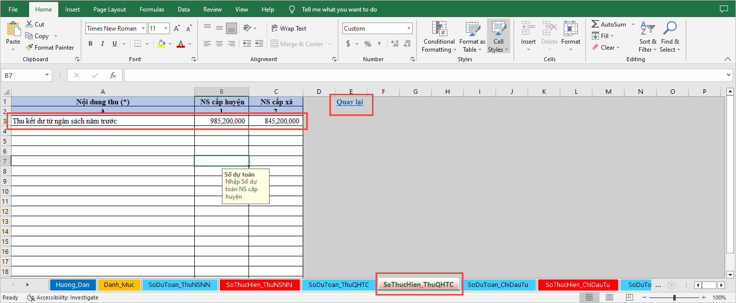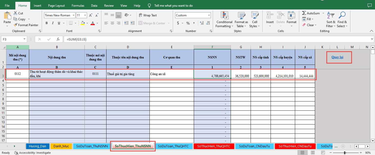 - Chọn sheet SoThucHien_ThuQHTC để nhập Số thực hiện Thu quan hệ tài chính