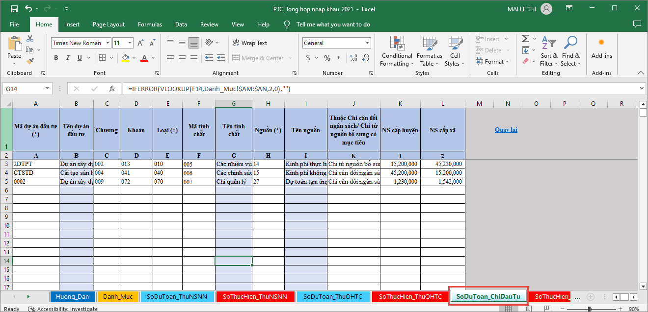 - Chọn sheet SoThucHien_ChiDauTu để nhập Số thực hiện Chi đầu tư.