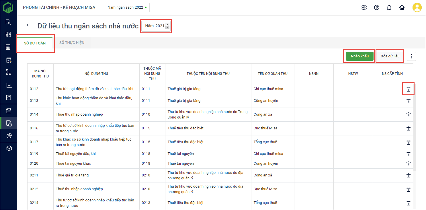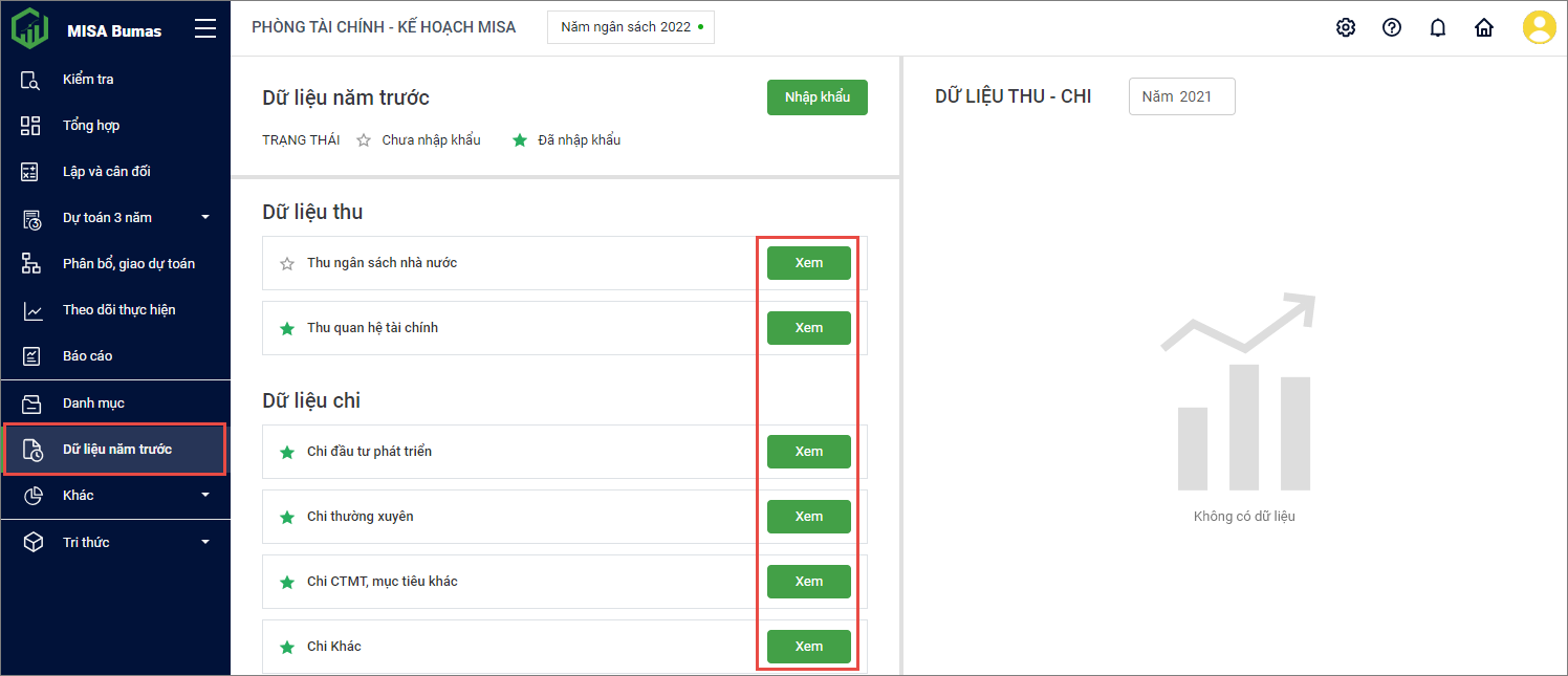 1. Tại phần Dữ liệu thu, chi; nhấn Xem để xem chi tiết dữ liệu sau khi nhập khẩu.