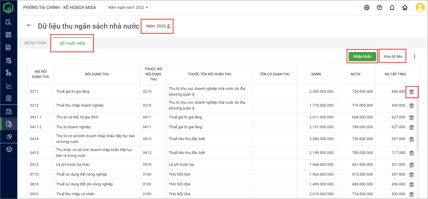 - Chọn tab Số Thực hiện để xem số thực hiện thu NSNN. Đơn vị có thể chọn năm để xem dữ liệu.