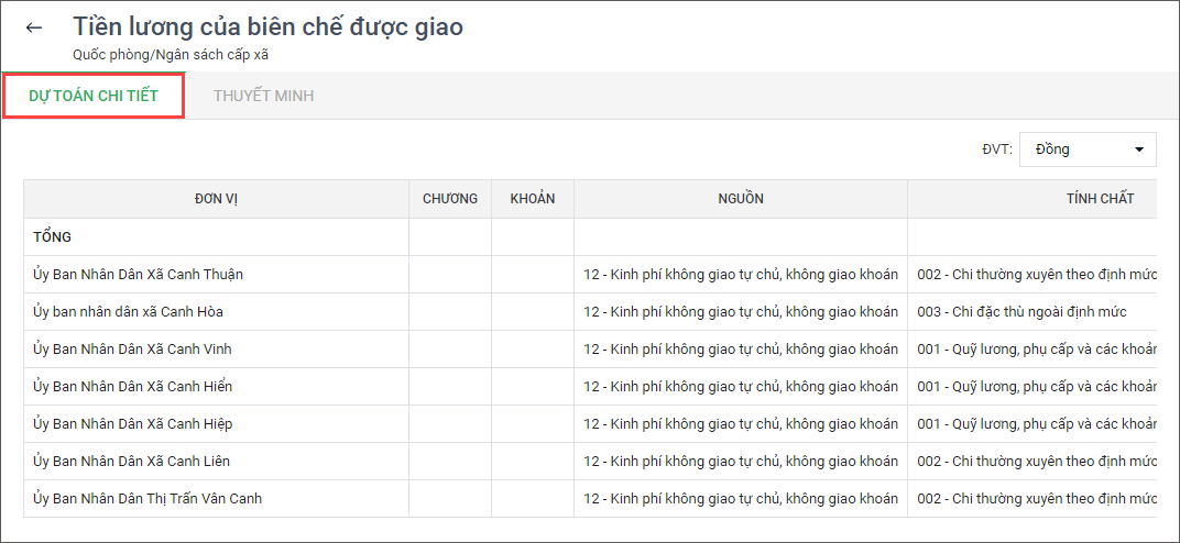 - Tại tab Dự toán chi tiết, anh/chị xem được bảng dự toán chi của nội dung được chọn chi tiết đến từng đơn vị thực hiện.