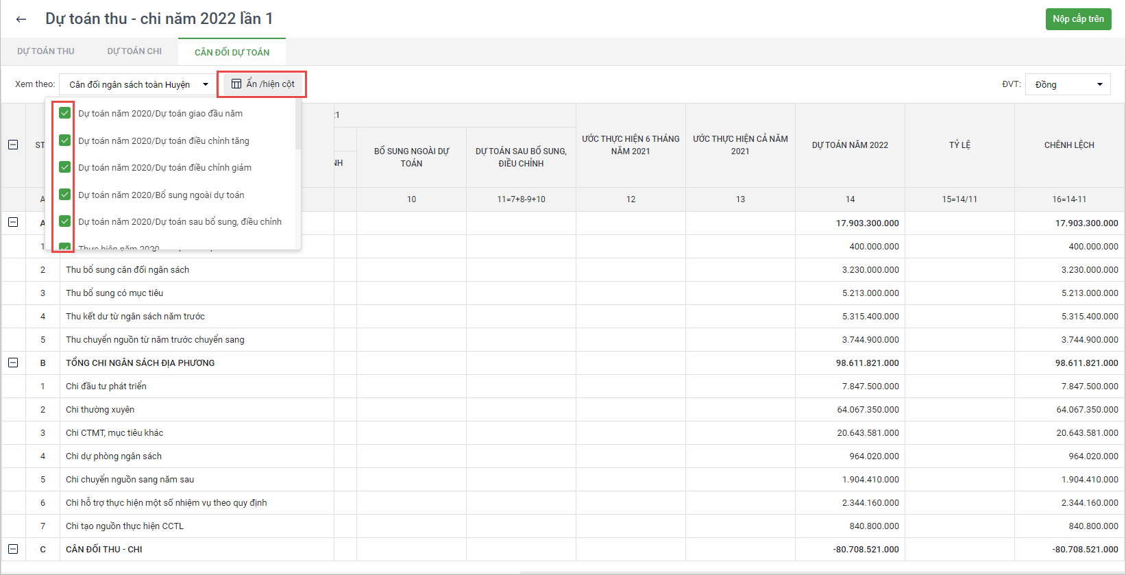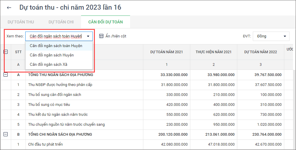 - Chọn xem cân đối dự toán theo: Cân đối ngân sách toàn Huyện, Cân đối ngân sách Huyện, Cân đối ngân sách Xã.