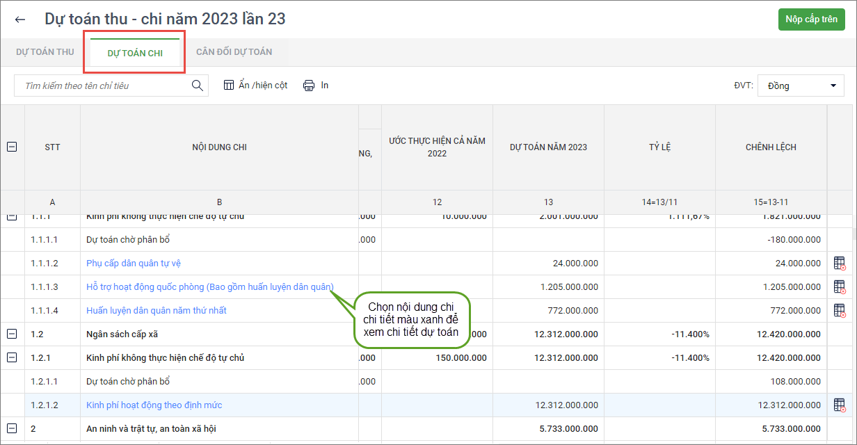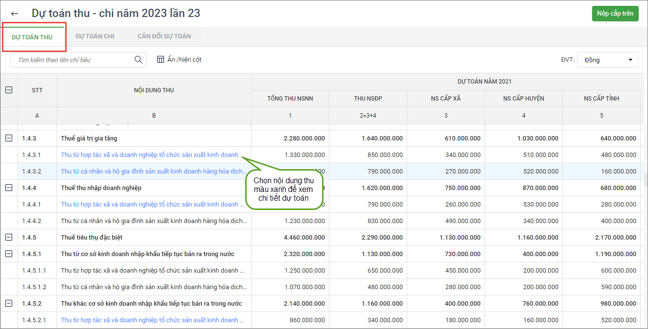- Để xem chi tiết dự toán thu theo đơn vị Xã/Phường, chọn vào 1 nội dung thu NSNN chi tiết nhất (màu xanh).