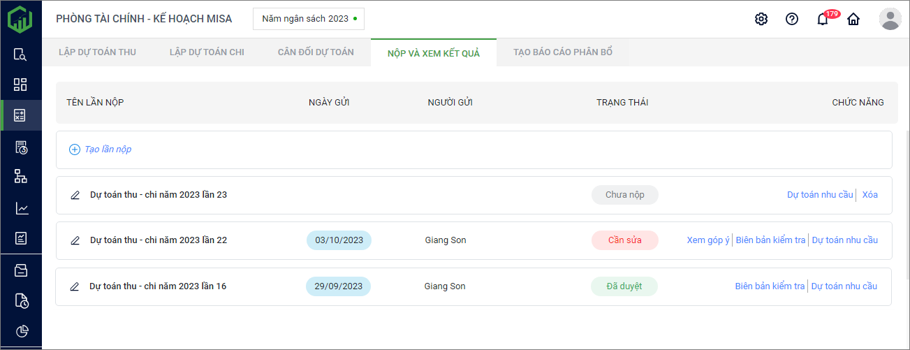 Sau khi đơn vị nộp dự toán lên cấp trên, đơn vị đợi cấp trên kiểm tra lại và gửi phản hồi lại cho đơn vị cấp dưới. Tại tab Nộp và xem kết quả, anh/chị có thể sử dụng một số chức năng sau: