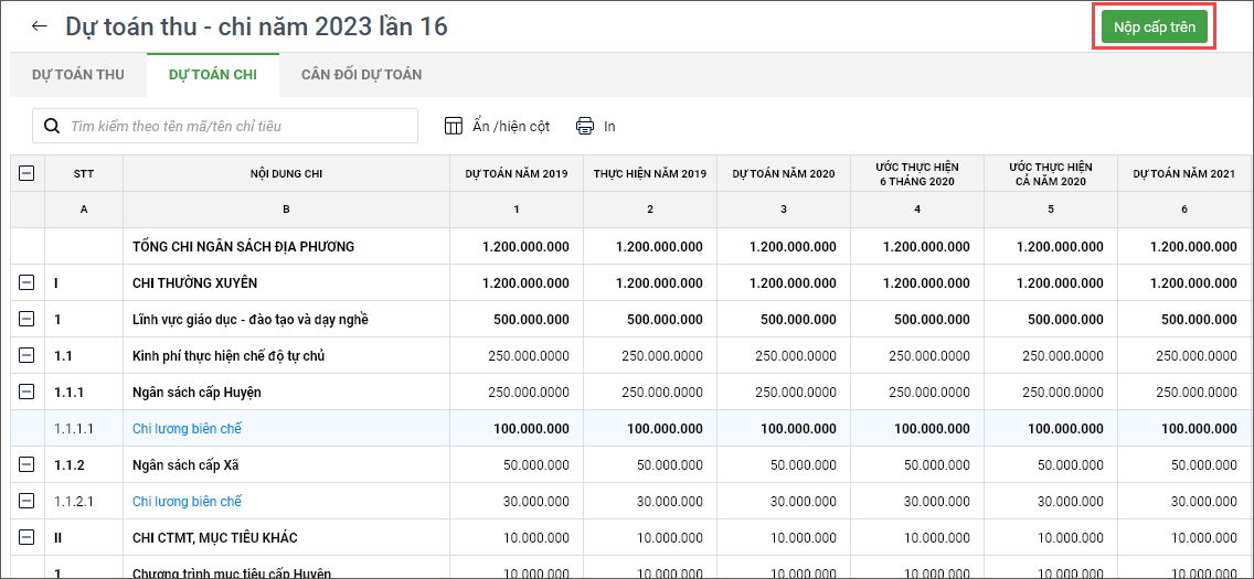 5. Để nộp dự toán cho đơn vị cấp trên, nhấn Nộp cấp trên.