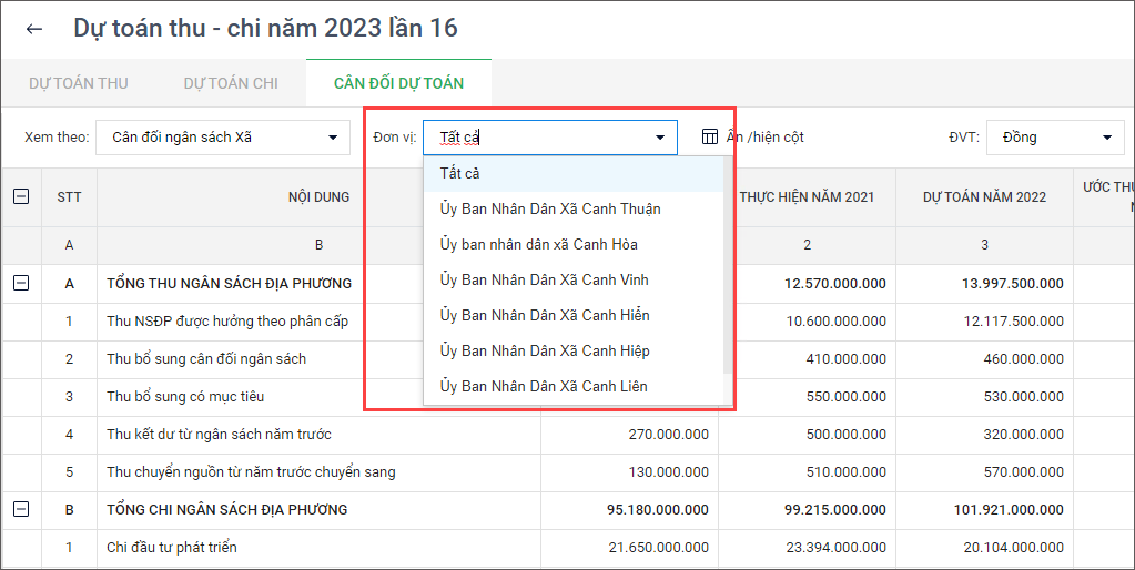 - Trường hợp xem theo Cân đối ngân sách Xã, anh/chị có thể sử dụng bộ lọc để chọn Đơn vị cụ thể cần xem.
