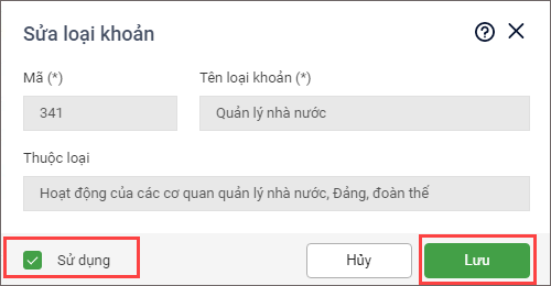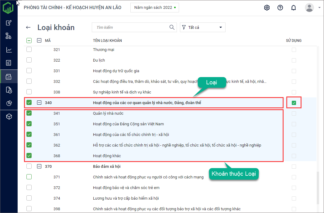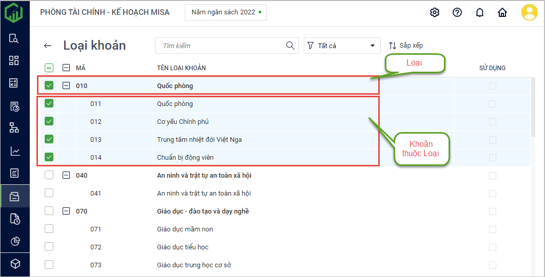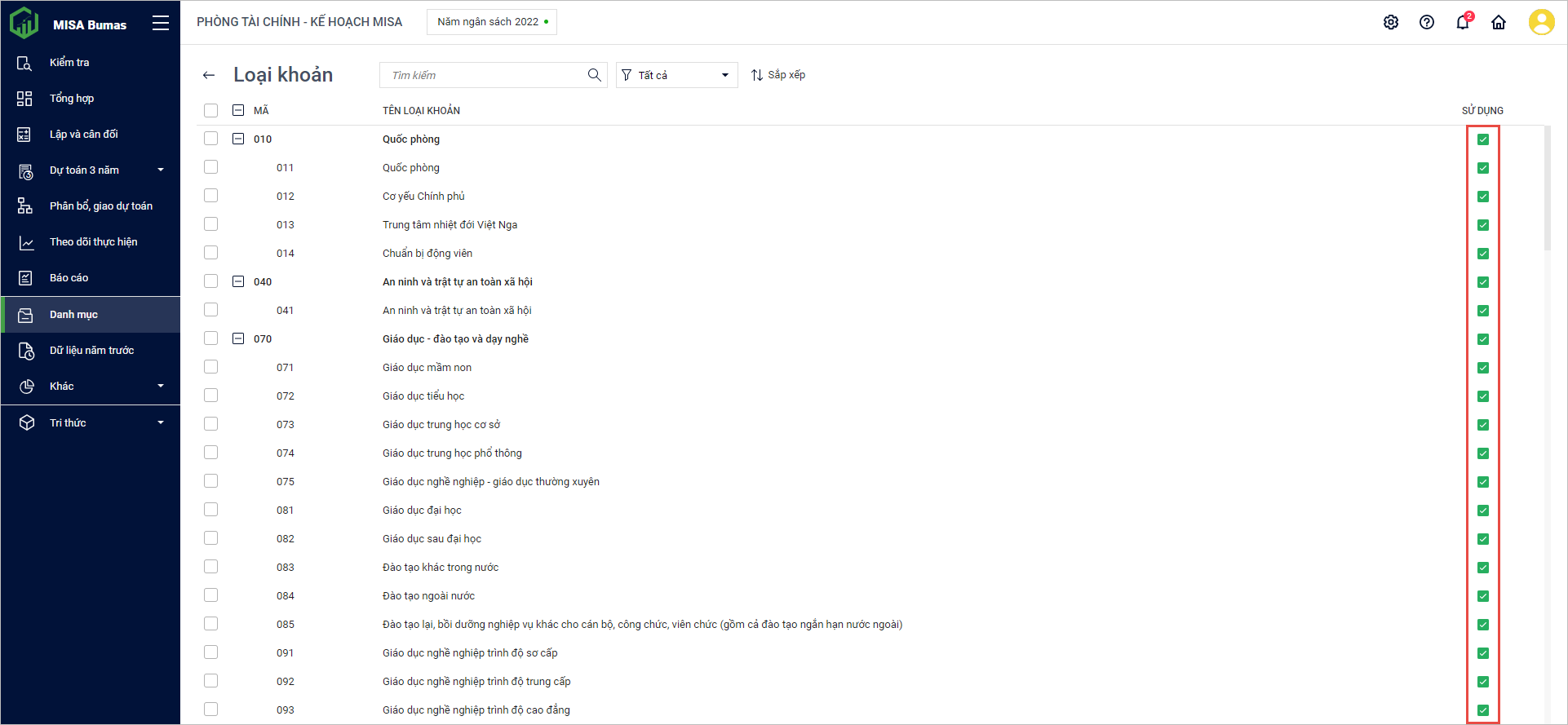 Phần mềm đã lấy lên danh mục Loại – Khoản được Sở tài chính ban hành, và đã được tích chọn sử dụng.